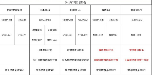 香港PCCW不但比中華電信便宜,而且提供的是雙向對等的傳輸速率。還有,香港2011年的物價是全球第9,遠高於台北(台北排名第52)。